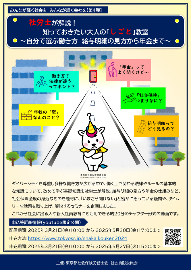 東京都社会保険労務士会(会長:寺田 晃)は、「みんなが輝く社会を、みんなが輝く会社を」をテーマに第4弾となるセミナー『社労士が解説!知っておきたい大人の「しごと」教室 ~自分で選ぶ働き方 給与明細の見方から年金まで~』を開催。2025年3月21日(金)から5月30日(金)まで、YouTubeにて配信いたします。