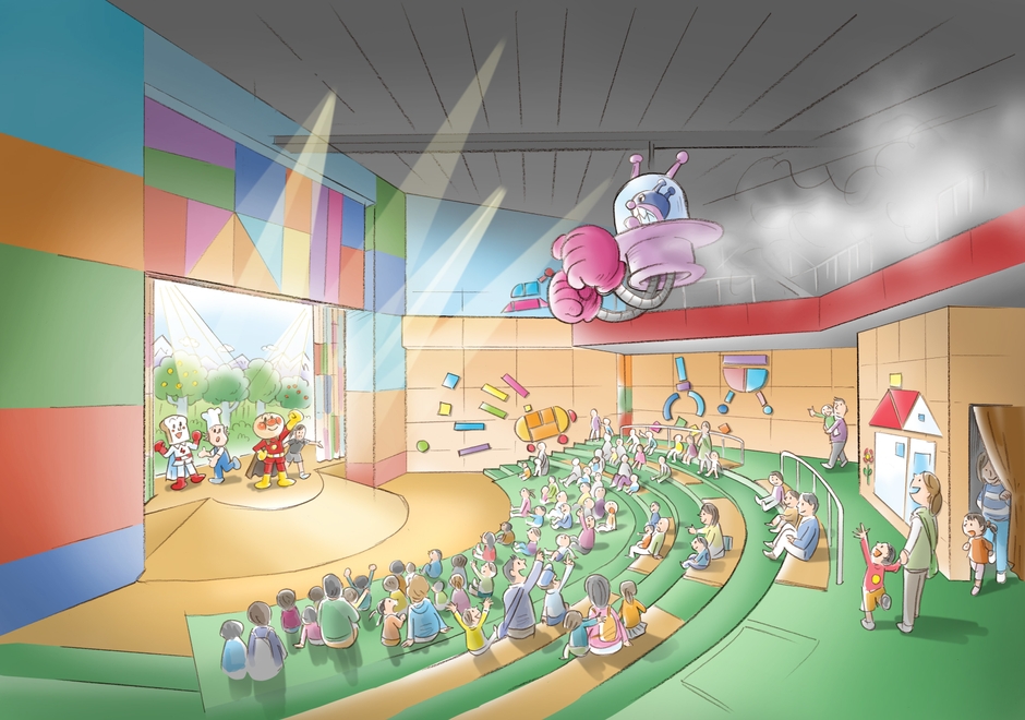 新たに生まれ変わる「やなせたかし劇場」は、全国5館にあるアンパンマンこどもミュージアムの中で初めて屋外に建てられたアンパンマンの専用劇場です。ステージはスロープ型の形状で、アンパンマンたちが子供たちの客席近くまでやって来ます。天井高8メートルを活かした迫力のあるショーが展開します。