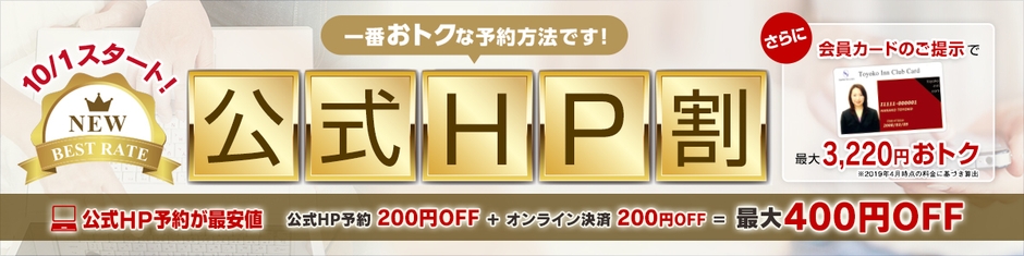 株式会社東横イン(本社:東京都大田区、代表執行役社長:黒田 麻衣子)は、2019年10月1日から「公式HP割<最大400円OFF>」をスタートします。同日から2020年3月31日宿泊分まで、公式HPでご予約いただきますと、通常の宿泊料金から200円割引、オンラインカード決済ではさらに200円割引、合計で400円割引になります。