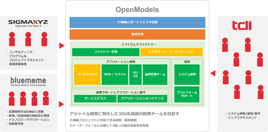 この度、ますます多様化するニーズに対応できる体制を構築するべく、アジャイル開発に特化したシステム開発会社「OpenModels(BlueMeme子会社)」の設立を通じて、BlueMeme、シグマクシスとの3社による協業を開始しました。
