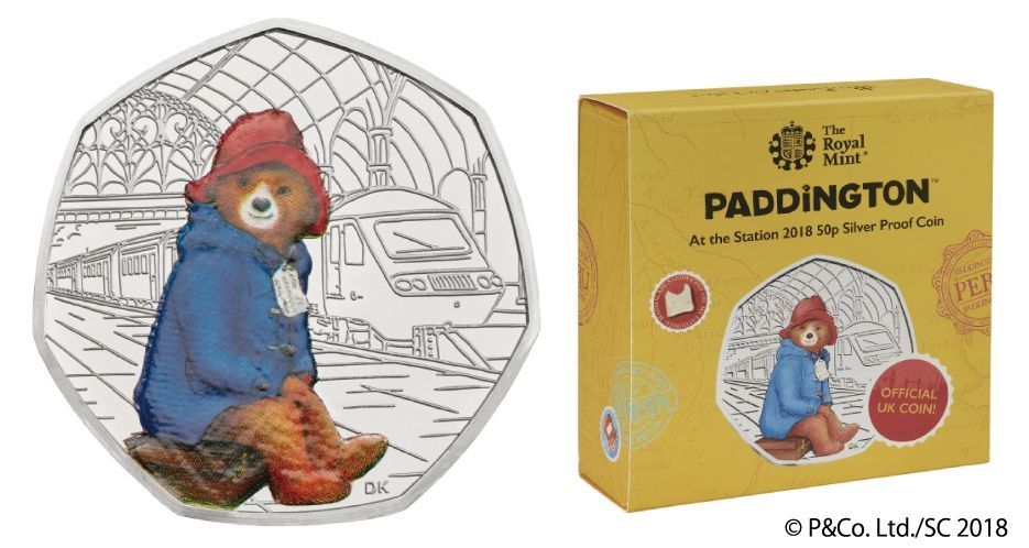 今回のシリーズ第1弾「パディントン駅のパディントン(TM)」50ペンス貨のラインナップは、金貨、カラー銀貨、白銅貨の3種。各裏面には、ダッフルコート、古びたブッシュハットを身につけたパディントンが鉄道の駅にいる、物語の始まりのシーンがデザインされています。