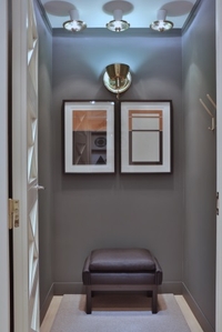 フィッティングルームには、スウェーデンのアンティークの突き出しの燭台が壁に取り付けられており、テーブルやカウンターの上には、フィンランド人デザイナーのグラスウェアがディスプレイされています。