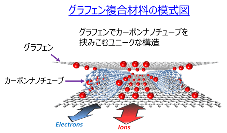 しかし、従来のグラフェン電極は、単層グラフェンの再スタック(積層)による特性の劣化が課題でした。そこで、株式会社マテリアルイノベーションつくばは、カーボンナノチューブをスペーサーとして活用する独自技術を開発し、新規複合材料「Gmit(R)」(図1)を誕生させました。
