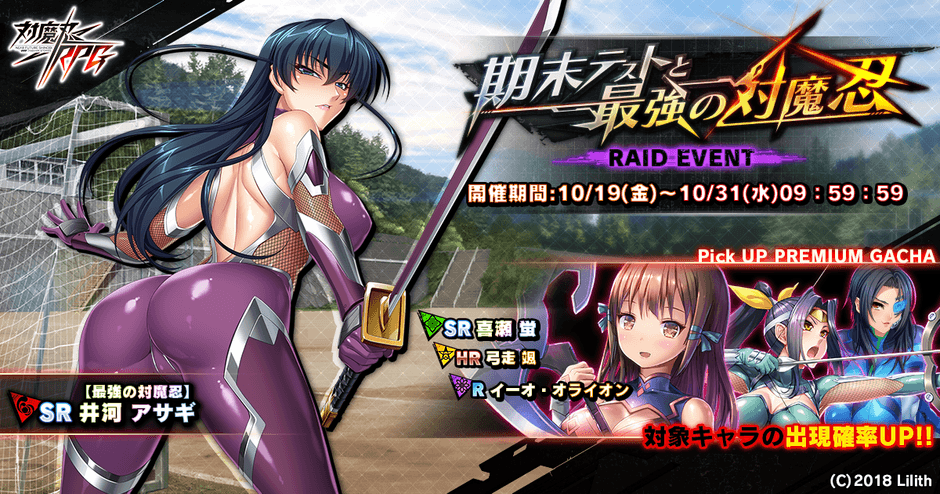 株式会社インフィニブレイン(本社:大阪市中央区、代表取締役:市川 忍)は、オンラインゲームプラットフォーム「DMM GAMES」( http://games.dmm.com/ )にて配信している、近未来くノ一ロールプレイングゲーム『対魔忍RPG』において、期間限定イベント「期末テストと最強の対魔忍」を2018年10月19日(金)~31日(水)に開催いたします。