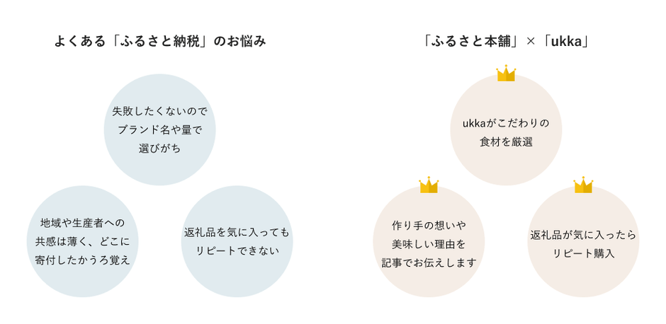 株式会社CARTA HOLDINGSのグループ会社である株式会社ふるさと本舗(東京都渋谷区、代表取締役CEO:船方 翔馬)は、運営する特産品ポータルサイト「ふるさと本舗」( https://furusatohonpo.jp/ )において、ふるさと納税制度をきっかけにした関係人口(※)の創出を図るため、2019年11月13日、株式会社ukka(東京都千代田区、代表取締役 谷川佳、小林俊仁)が運営する旬の食材を生産者から直接購入できるD2Cプラットフォーム「ukka」(https://ukka.green/)と連携し、気に入った返礼品をいつでも購入することができる返礼品購入機能を拡充いたしました。これにより「ふるさと本舗」では、ふるさと納税として寄付するだけではなく、返礼品と同じ商品をいつでも購入することができるようになり、一方「ukka」では、商品を購入するだけではなく、ふるさと納税として寄付することができるようになりました。