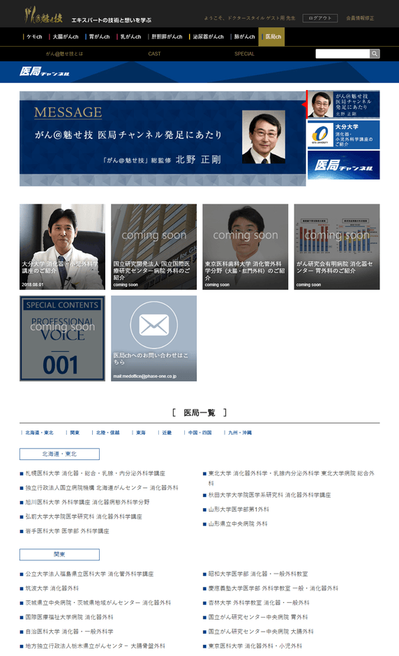 8月1日の開設では消化器がん領域の医局を取り上げ、乳がん領域、呼吸器がん領域と紹介する医局を拡充してまいります。また、映像を活用した情報発信にも積極的に取り組んでまいります。