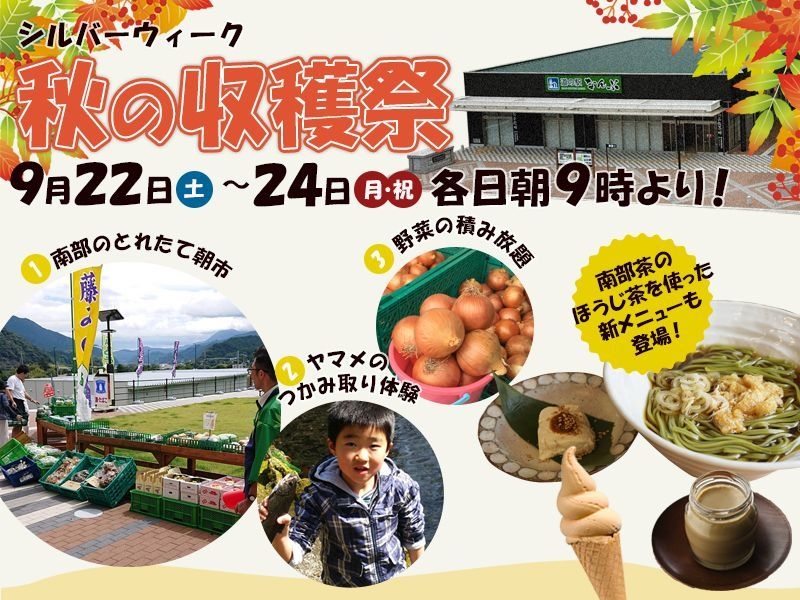 ~道の駅なんぶ オープンから1ヵ月で来場者約15万人を突破~ 秋のシルバーウィークは“秋の収穫祭”を開催! 南部のとれたて朝市やヤマメのつかみ取りなど企画盛りだくさん