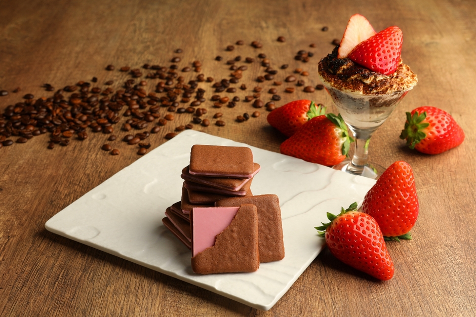 栃木県産スカイベリーとマスカルポーネチーズを使用したチョコレートを、コーヒーとココアパウダーを入れたサクサクのクッキーでサンドしました。苺チョコレートの甘酸っぱい風味と、ティラミスのほろ苦い風味がお口いっぱいに広がる、新しい美味しさを提供するスイーツとして劇的なデビューを果たしました。