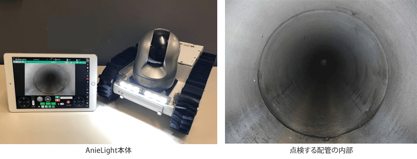 点検作業員は管の入口からタブレットでエニーライトを操縦し、本体に装備されたLEDで管内を照らし、高性能カメラの画像を見ながら管内の状況を確認できます。また、必要に応じて点検箇所を撮影してタブレットに保存すれば点検結果を記録として残すことが可能になります。
