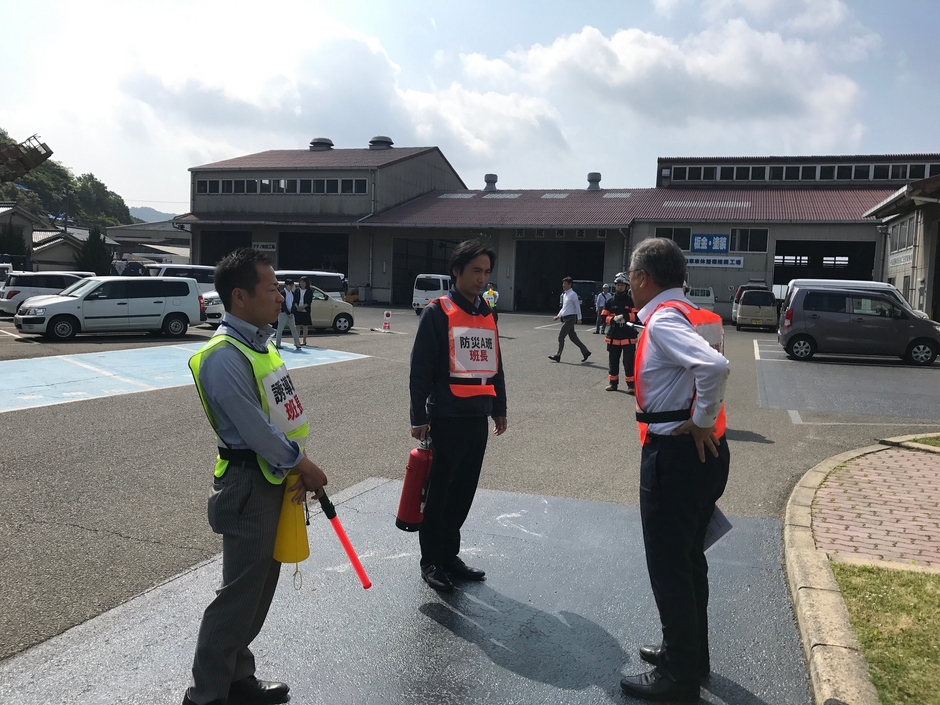 初期消火、通報、避難誘導からなる総合消防訓練は、福山地区消防組合西消防署沼隈内海出張所の指導のもと社員56名が参加し行われました。