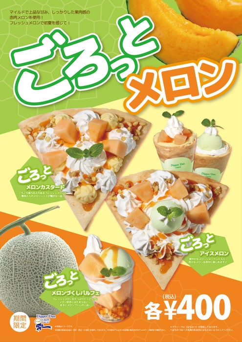 全国でクレープ専門店「ディッパーダン」を展開している 株式会社オレンジフードコート (本社:東京都江東区、代表取締役:内田 和明)は、 2019年4月26日(金)より、ディッパーダン店舗において 初夏の期間限定クレープ『ごろっとメロンカスタード』と 『ごろっとアイスメロン』2種のクレープ販売を開始致します。 (東海3県の店舗、ハウステンボス店、ヤフオクドーム店、清水寺店等、一部お取り扱いの無い店舗がございます) ▼ブランド公式サイト https://www.dipperdan.jp