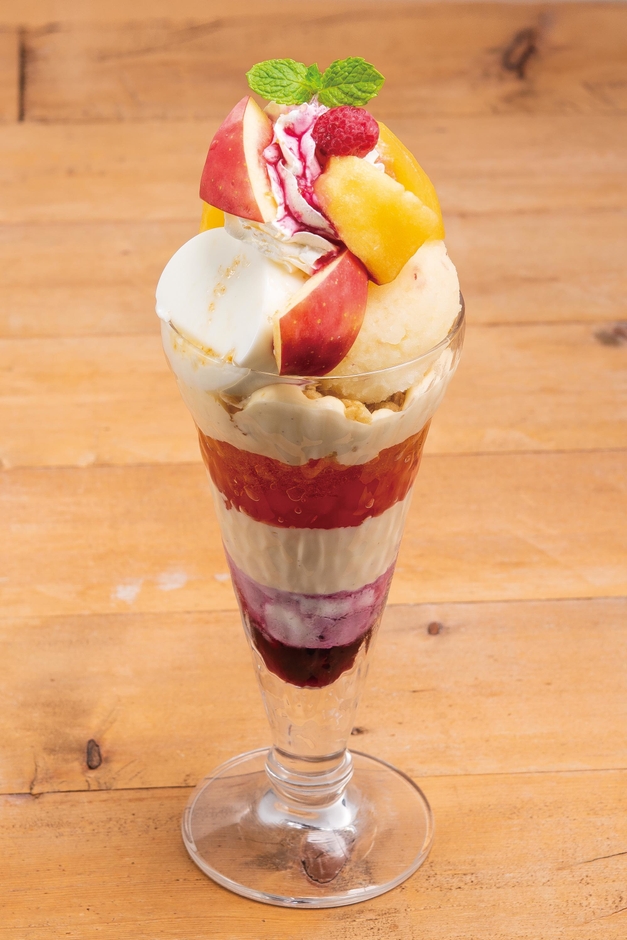 青森県産ふじ林檎をフレッシュ&カラメル煮で味わうザ・サンデー。グラスの中には林檎のクレームムースリーヌや林檎ゼリー、林檎のコンポートも隠れています。ブルーベリーやカシスの味わいもアクセント。一口ごとに林檎の多彩な魅力を感じていただけます。