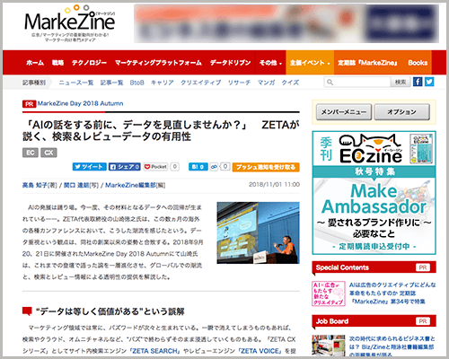 MarkeZine Day 2018 Autumnのセミナーレポート『「AIの話をする前に、データを見直しませんか?」 ZETAが説く、検索&レビューデータの有用性』が掲載されました
