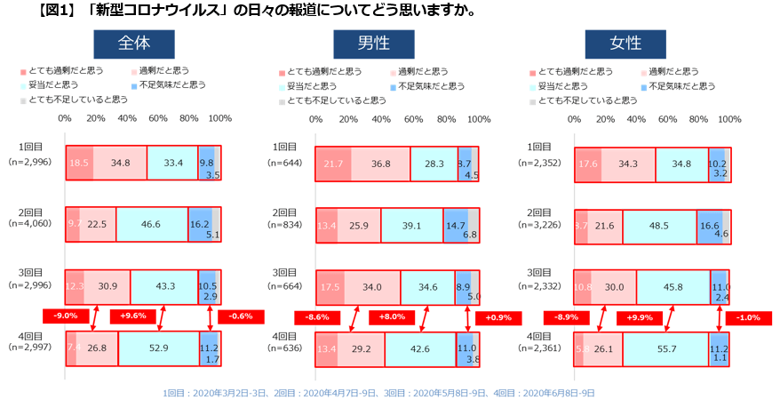 1:新型コロナウイルスの日々の報道について「妥当だと思う」が男女ともに過去最高の割合。(図1)