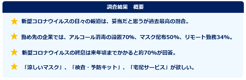 「新型コロナウイルス」の終息は来年頃までかかると約70%が回答。 コロナ禍で欲しい商品・サービスは「涼しいマスク」、「検査・予防キット」、「宅配サービス」。 ーインサイトテック ユーザーアンケートー