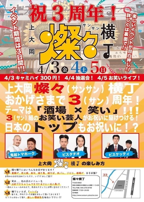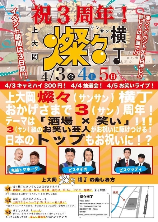 『横浜』上大岡燦々横丁3周年感謝祭4月3日~5日開催 豪華芸人3組!鬼越トマホーク・ピスタチオ・ビスケッティも登場