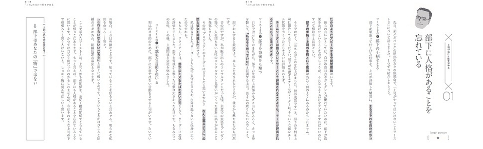 ▼悩める上司必見!8つのテーマ、50項目に渡って「現代の理想の上司」として、あるべき振る舞いを具体的に学べる!