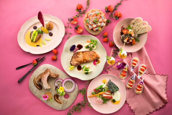 セミブッフェディナー「琉球マルシェ 春の“まーさむん”」は、沖縄の新鮮な食材をふんだんに使った5種から選べるメインメニューと、約30種のブッフェメニューをお好きなだけお楽しみいただけるメニューです。Weekday Sheraton Caféでは、苺やドラゴンフルーツを使用した、思わず写真に収めたくなる彩り鮮やかなケーキやタルトが新登場。シェラトン沖縄サンマリーナリゾートの「ダイニングルーム センス」から望む青い海やサンセットとともに、ご家族やご友人との素敵な春のひとときをお過ごしください。