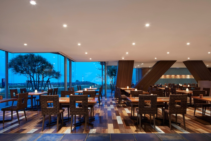 マルシェ”はフランス語で“市場”、“まーさむん”は沖縄の方言で“美味しいもの”を意味します。沖縄の“マルシェ”をイメージし、島にんじん、島らっきょう、マグロ、島サザエ、和牛などの県産の新鮮な島野菜や海鮮、肉類をふんだんに使い、この地沖縄だからこそ味わえる“美味しいもの”をお届けいたします。メインディッシュにはその日に仕入れる鮮魚や和牛などを使用した豪華なメニューもご用意しており、オープンキッチンでは旬の魚介と野菜の揚げたて天ぷらや沖縄そばも毎日提供いたします。