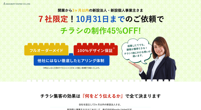 株式会社Minority United(マイノリティユナイテッド、所在地:神奈川県横浜市、代表取締役社長:山田 元樹)は、開業から3ヵ月以内の法人および個人事業主を対象に、A4サイズのチラシ制作を45%OFFのプレミアム限定価格(49,390円)で提供を行うキャンペーンを開始いたします。