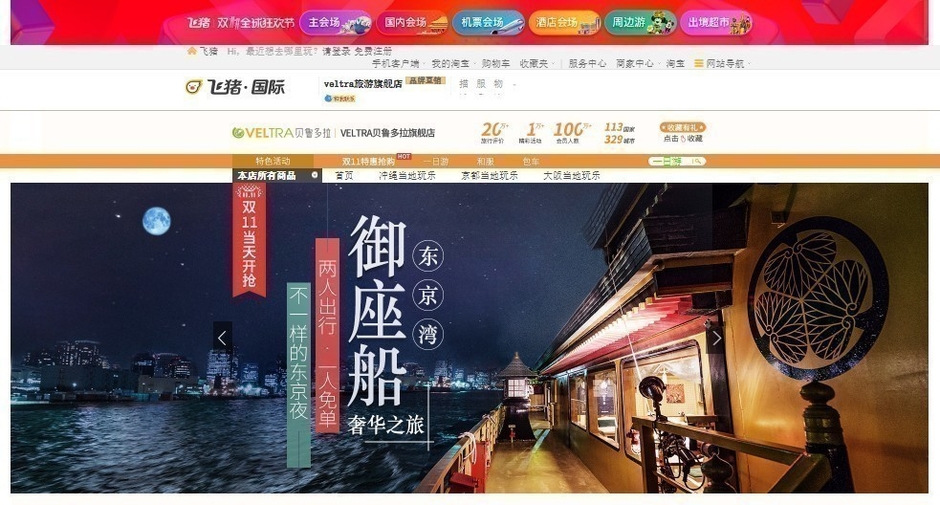 世界各地の現地オプショナルツアー専門予約サイト『ベルトラ』を運営するベルトラ株式会社(本社:東京都中央区、代表取締役社長:二木 渉、以下「ベルトラ」 / https://www.veltra.com/jp )は、中国最大手のEC運営企業 Alibaba Group(阿里巴巴集団)が運営する旅行専用プラットフォーム「Fliggy」(旧名称:Alitrip、阿里旅行)に2017年9月28日に旗艦店を出店、中国のインターネット通販における最大の商戦日11月11日独身の日セールでは、沖縄、東京、京都で参加できる体験アクティビティを期間限定の特別価格でのキャンペーンを実施しています。