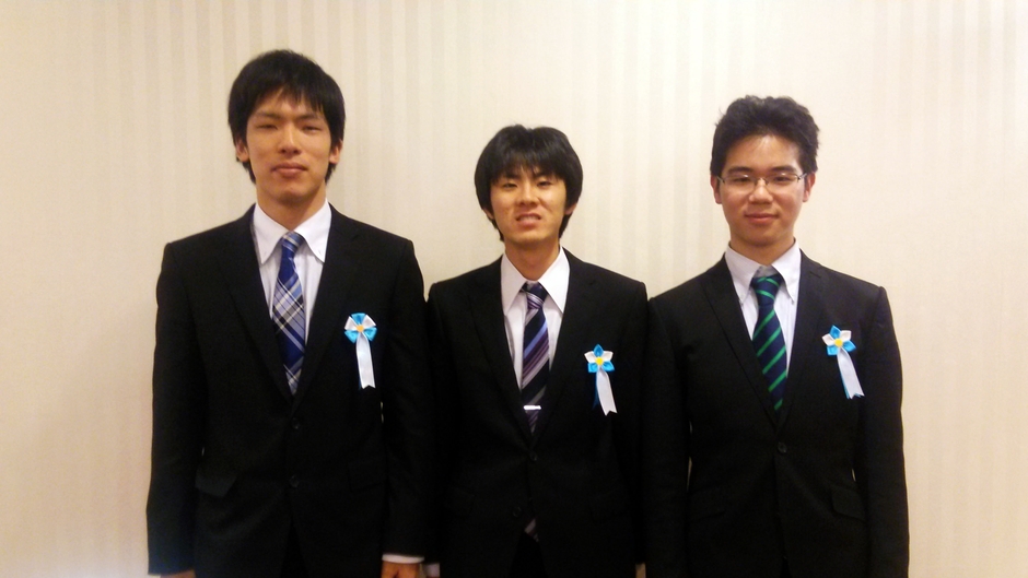 ツネイシパートナーズ賞を受賞した岡山大学大学院の齊藤塁さん、濱野友希豊さん、後藤剛さんは「岡山大学の近辺にも視覚障がい者用音響信号機が設置されており、視覚障がい者への安全性も確保し、騒音問題の軽減ができたらと考えました。生活の身近なところで社会に貢献できるものを提案したいという想いから発想しました。自分たちが提案したプラン、システムが世間にも評価されたことが嬉しい。」と感想を述べました。
