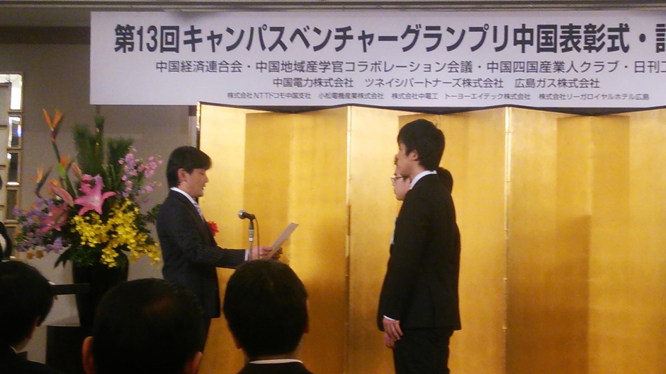 学生によるビジネスアイデア提案コンテスト「第13回キャンパスベンチャーグランプリ中国」の授賞式が2015年1月20日(火)広島市中区のリーガロイヤルホテル広島で開催され、岡山大学大学院が発表した、テーマ「視覚障害者のための新しい音響システム」に、ツネイシパートナーズ賞が贈られました。