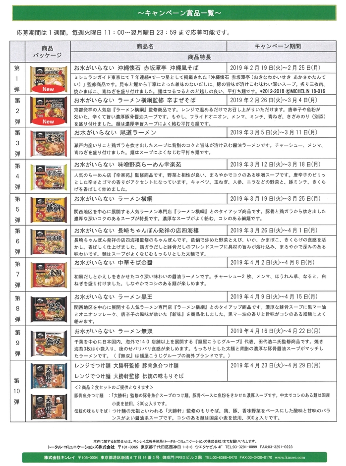年間販売数2,000万食を突破した「お水がいらない」シリーズの新商品を含む計10品が毎週100名様、総勢1,000名様に当たります。
