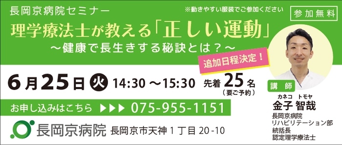 【大好評につき、追加日程が決定!】 長岡京病院、6月25日(火)にセミナーを開催 理学療法士が教える「正しい運動」 ~健康で長生きする秘訣とは?~