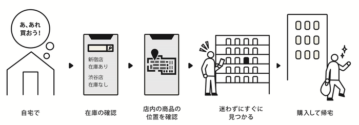 アプリケーションから商品を検索して、商品がどの棚にあるのかフロアマップ上で確認することができます。お客さまは欲しい商品について、店舗での商品位置を来店前・来店中に確認でき、店舗の取り扱い有無を来店前に確認することができるなど利便性が向上します。