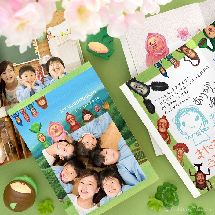 野山を背景に、カクレモモジリをはじめとする人気のコビトが集まった賑やかなデザイン。巻頭のメモ欄は 4 ページ分用意し、表紙と同じコビトが登場します。メモ欄のうち見開き 2 ページは寄せ書き用に使え、卒園・卒業アルバムに最適です。