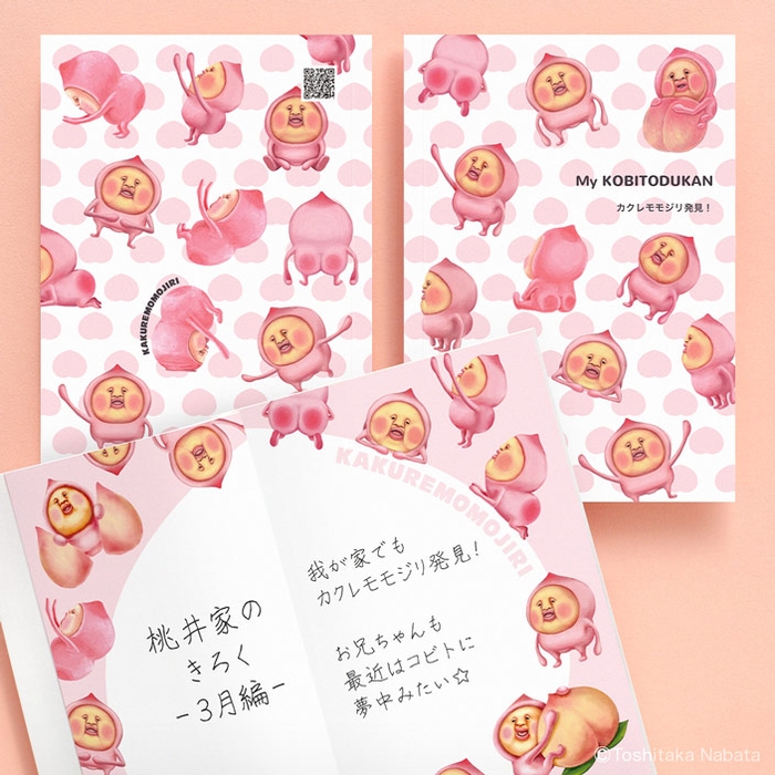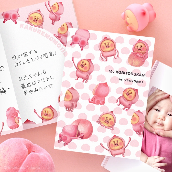 一番人気のカクレモモジリのコミカルな動きを詰め込んだデザイン。巻頭 2 ページのメモ欄は見開きで大きく桃の形の枠を配置しました。コビト好きな子供も、カクレモモジリファンの女子もテンションが上がるフォトブックが作れます。