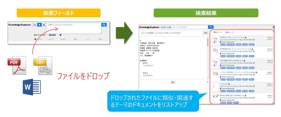 Knowledge Explorerは、ユーザーが気付いていない「価値ある情報」を手間なく探し出すことができる、ナレッジマネジメント支援システムです。最新バージョンでは、ファイルをドロップして類似・関連テーマを持つ文書ファイルが検索できる機能を搭載しました。また、Web APIを公開して、外部システムとの連携を容易にしました。