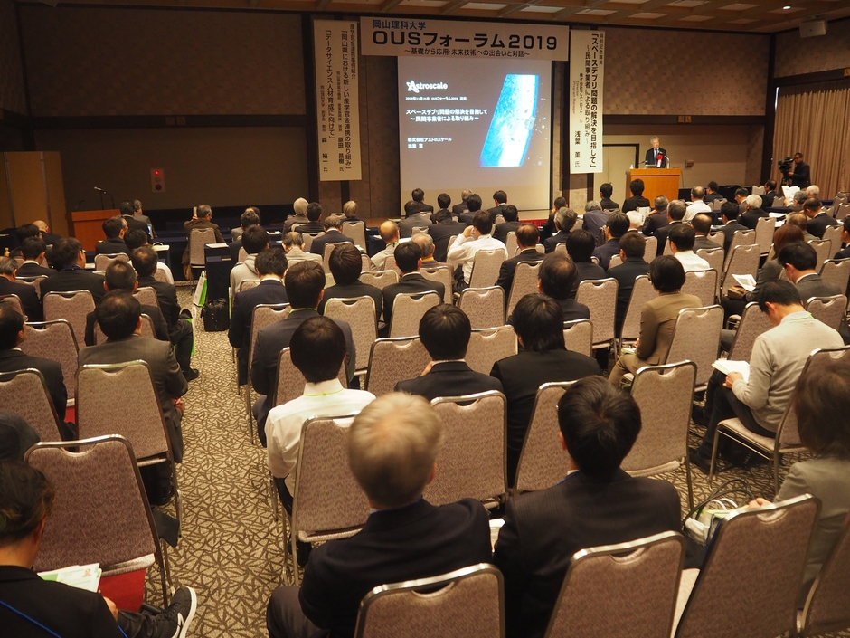 大学の研究シーズをベースに産学官の連携を推進していこうと、岡山理科大学(岡山市北区理大町)は2019年11月25日、岡山市中区のホテルで「第19回OUSフォーラム」を開催しました。会社経営者ら約400人が訪れて、講演やポスター展示による研究発表などに熱心に耳を傾けていました。