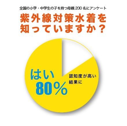 水泳用品メーカーのフットマーク株式会社(本社:東京都墨田区、代表取締役社長:三瓶 芳)は、小学1年生から中学3年生までの子どもを持つ母親200名に、「わが子についての水泳授業における紫外線の認識調査」を実施いたしました。紫外線意識の高まる昨今、学校のプール授業の場面でも使用の普及が広がる「『紫外線対策水着』を知っていますか?」については80%の母親が「はい」と回答。認知度の高さがうかがえました。紫外線対策水着とは、紫外線対策や露出軽減を目的に水着の上からでも着られるシャツ型の水着のことで、特に九州や関西方面では年々使用が盛んになってきています。現在、学校の水泳授業用の水着は大きく指定水着と自由購入に分かれていますが、紫外線対策水着については、個別に学校の許可を得て個人で購入というケースが多く見られます。以前はアトピーや肌の弱い子どもについては着用が許可されておりましたが、それだけ個人の関心が大きく、学校も対応しているという状況にあります。