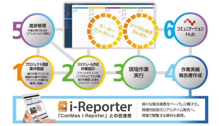 最大の特長としては、当社製品である1,793社以上(2019年11月末現在)の導入実績があるペーパーレス『現場帳票』記録・報告・閲覧ソリューション『ConMas i-Reporter』と簡単な操作で、シームレスに連携することが可能であり、帳票とプロセスが密接に関連する現場の「帳票作成指示、帳票入力、完了報告」などの進捗管理業務の効率化することができます。