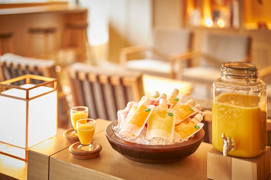 絞り方や凍結技術に定評のある国産の柑橘飲料「AJIOH 食べるより美味しい冷凍ジュース」。温泉旅館で滞在中のお客様に、湯上がりや食後などにお飲みいただけるドリンクとして提供いたします。これまで、お客様に提供している通常のドリンクに加えることで、飲む楽しさ、選ぶおもしろさ、逸品に出会う喜びを増やします。国産農林水産物の事業者とともに生み出す、温泉旅館での旅情を盛り上げるおもてなしです。