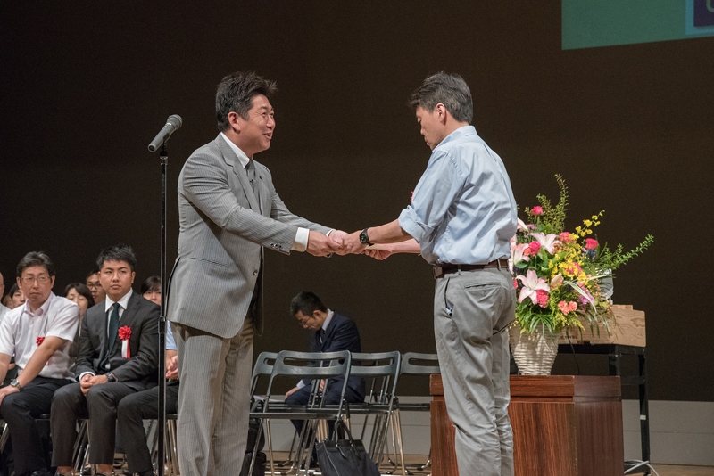 かわさき健幸福寿プロジェクトは、要介護状態の改善・維持を促進する川崎市独自の取り組みです。質の高い介護サービスを評価する仕組みをつくり、要介護度等の改善・維持に向けて努力する介護事業所を応援することで、介護サービスの質を向上させることを目指しています。表彰式では、2016(平成28)年7月~2017(平成29)年6月の期間で実施した第1期かわさき健幸福寿プロジェクトで、要介護度等の改善・維持において成果をあげた介護サービス事業所と介護サービス利用者の皆様をお迎えして、福田 紀彦 川崎市長から表彰を行いました。