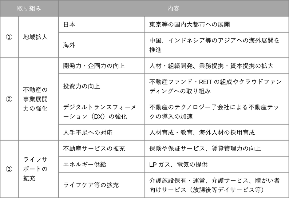 一方、シノケングループは、福岡で1990年に創業し、新築木造アパートメント経営による不動産投資を一般的な会社員層でも無理なくできるよう支援する不動産セールス事業と不動産サービス事業を中心に、建設、エネルギー、不動産ファンド、介護・障がい者サービスなど、国内外に事業展開してきました。今年創業30周年を機に、ビジョンとして『世界中のあらゆる世代のライフサポートカンパニー』、ミッションとして、『REaaSTM※2で人々や社会の課題を解決する』を掲げ、(1)地域拡大、(2)不動産の展開力の強化、(3)ライフサポートの拡充という、三つの取り組みにより、成長余地の拡大、ストック収入の拡充、利益構成の適正化を進めております。特に、現時点において、シノケングループが戦略的に強化していくのが不動産及びライフサポートのデジタルトランスフォーメーションであります。