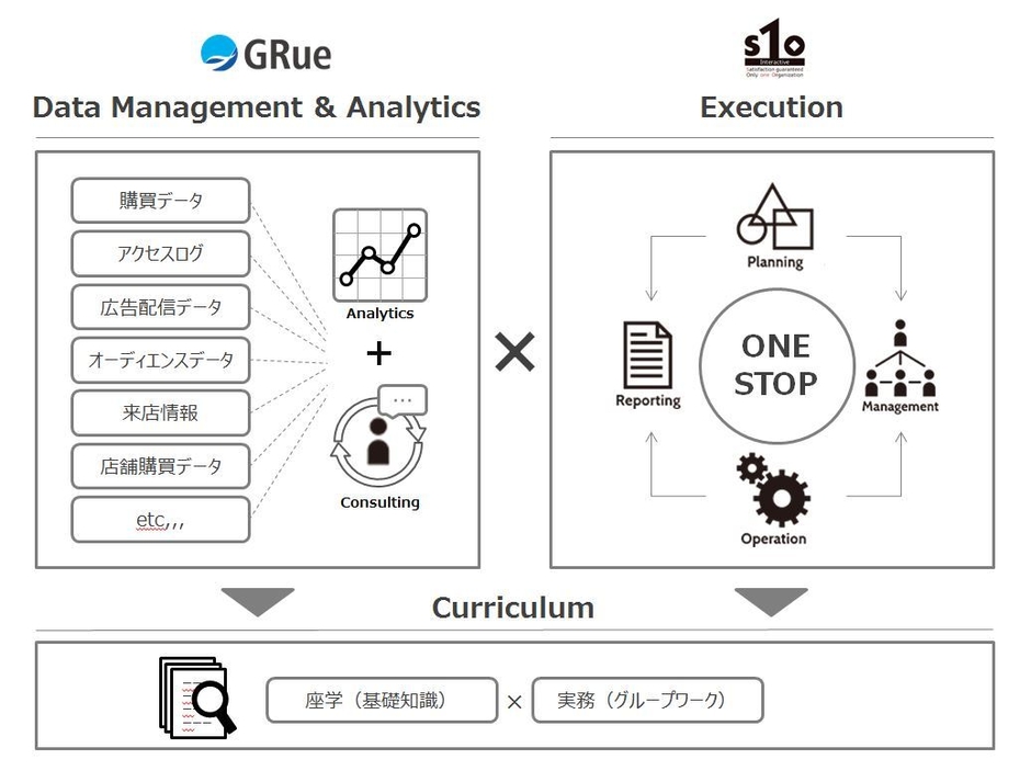 エスワンオーインタラクティブは、GRueと連携し、マーケティング活動から得られる大量のデータをアカデミックに分析し、かつ運用にスピーディに繋げることでWeb広告領域は勿論の事、広告主側の事業視点を起点としたオンライン施策全体のパフォーマンス最大化を致します。また、業界課題の一つと捉えている教育領域において、エスワンオーインタラクティブが提供している「インハウスカリキュラム」において統計学を用いた教育コンテンツを開発し外部に提供していくことで、事業視点を養い、かつ分析・運用スキルを保有する人材育成にも注力して参ります。
