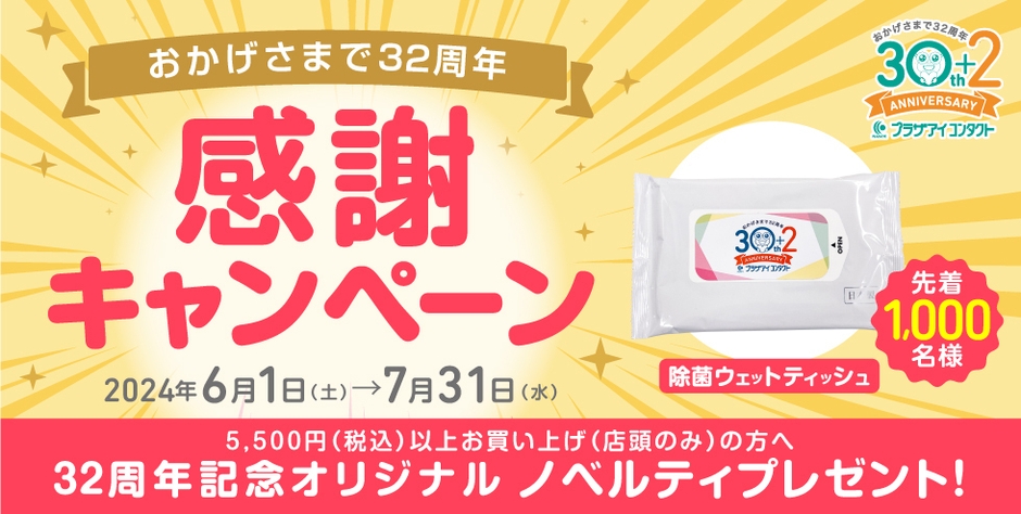 5月28日(火)に32周年を迎えたコンタクトレンズ専門店 プラザアイ コンタクトでは、5,500円(税込)以上お買い上げのお客様に、プラザアイ コンタクト32周年記念除菌ウェットティッシュを全店舗で先着1,000名様にプレゼント!