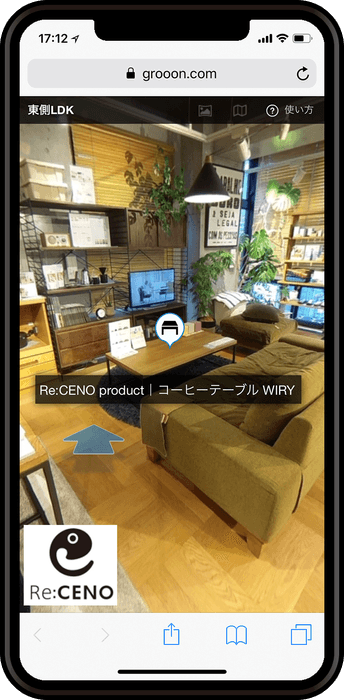 インフィニットループが開発した「Grooon」では撮影された360°の画像を、VRで「パノラマツアー」として展開し、実際にショールームにいるかのように商品を見ながら進むことができます。