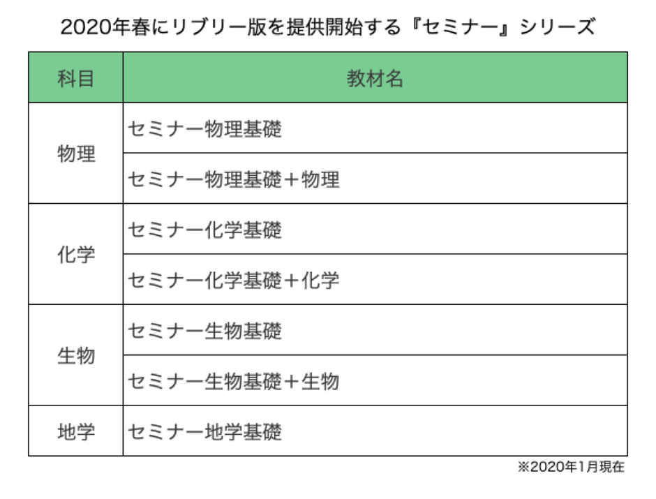 これにより、2020年4月から、第一学習社の高校理科の学校採用問題集『セミナー』シリーズの理科4科目(物理・化学・生物・地学)全てを「リブリー」でお使いいただけるようになります。リブリー版のリリースが決定している『セミナー』シリーズの書籍は下記の7冊です。