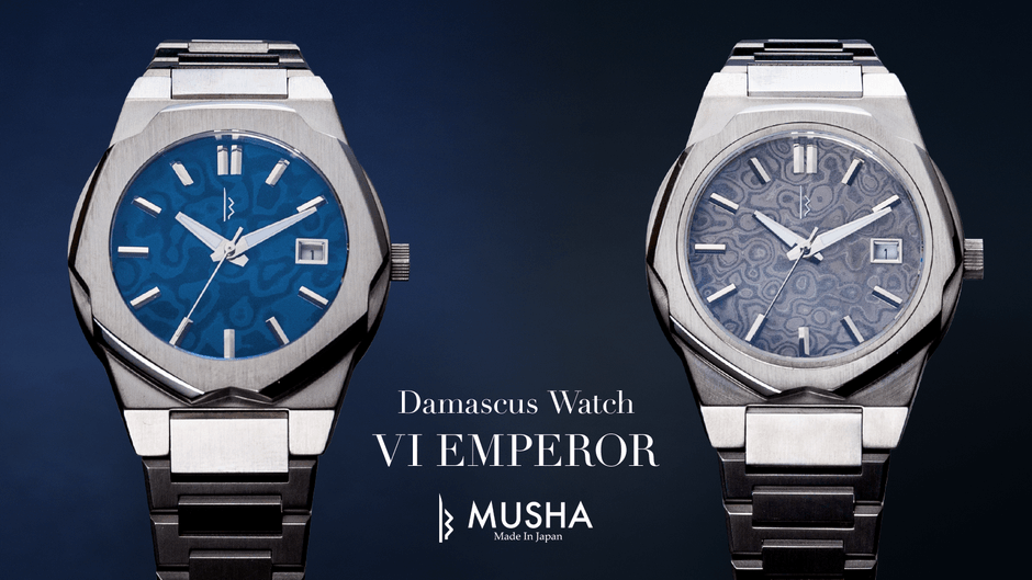刃物のまち岐阜県関市においてプロダクトデザイン、オリジナルブランドの製造販売を行っている株式会社ソウゾウは、刃物鋼材を使用したファッションアイテムブランド「MUSHA Made In Japan」を運営しています。このたび、高級包丁やカスタムナイフに通常使用される、磨くと模様が浮かび上がる鋼材「ダマスカス鋼」を使用した腕時計『VI EMPEROR』を、2021年2月10日よりMakuakeにて先行予約販売いたします。