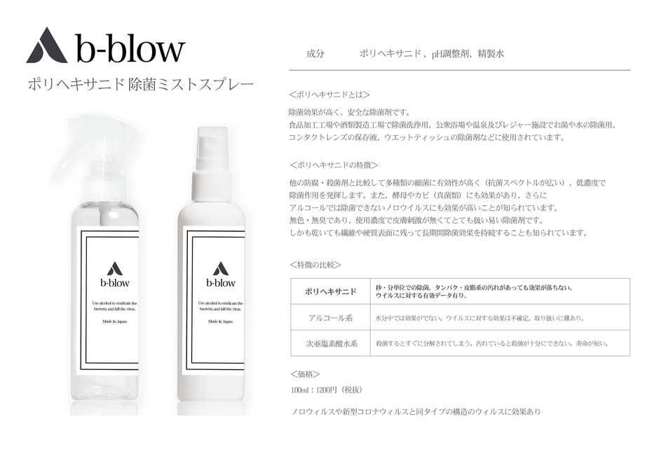 「b-blow」は、一般的に除菌で利用されているアルコールや次亜塩素酸水以上の殺菌性・安全性を持つポリヘキサニドを利用した除菌ミストスプレーです。