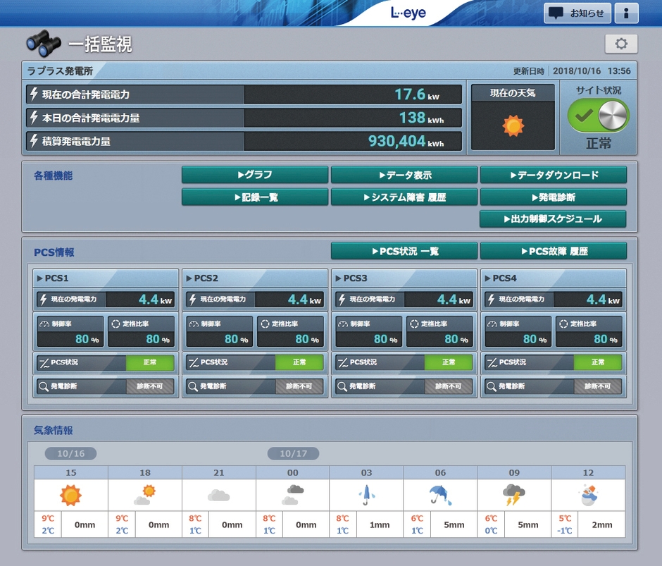 2016年に販売開始した太陽光発電遠隔監視システム&サービス L・eyeは、PCSと直接通信することで発電電力量を高精度で取得し、高機能監視を実現します。また、PCS毎の故障や異常などの詳細情報も取得するため、発電機会の損失を最小限に抑えることができます。数多くの発電事業を支え、モニタリングシステムの導入容量は業界No.1※。
