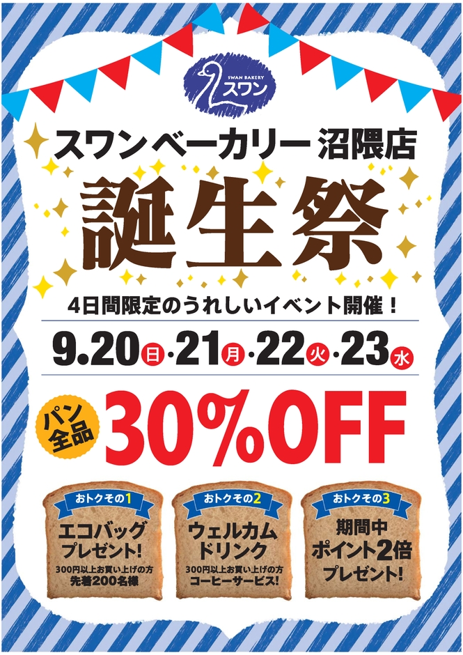 スワンベーカリー沼隈店 Happy 7th Anniversary ~ 9/20から4日間限定の誕生祭イベント開催!