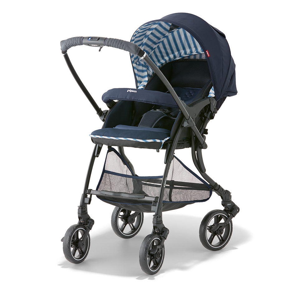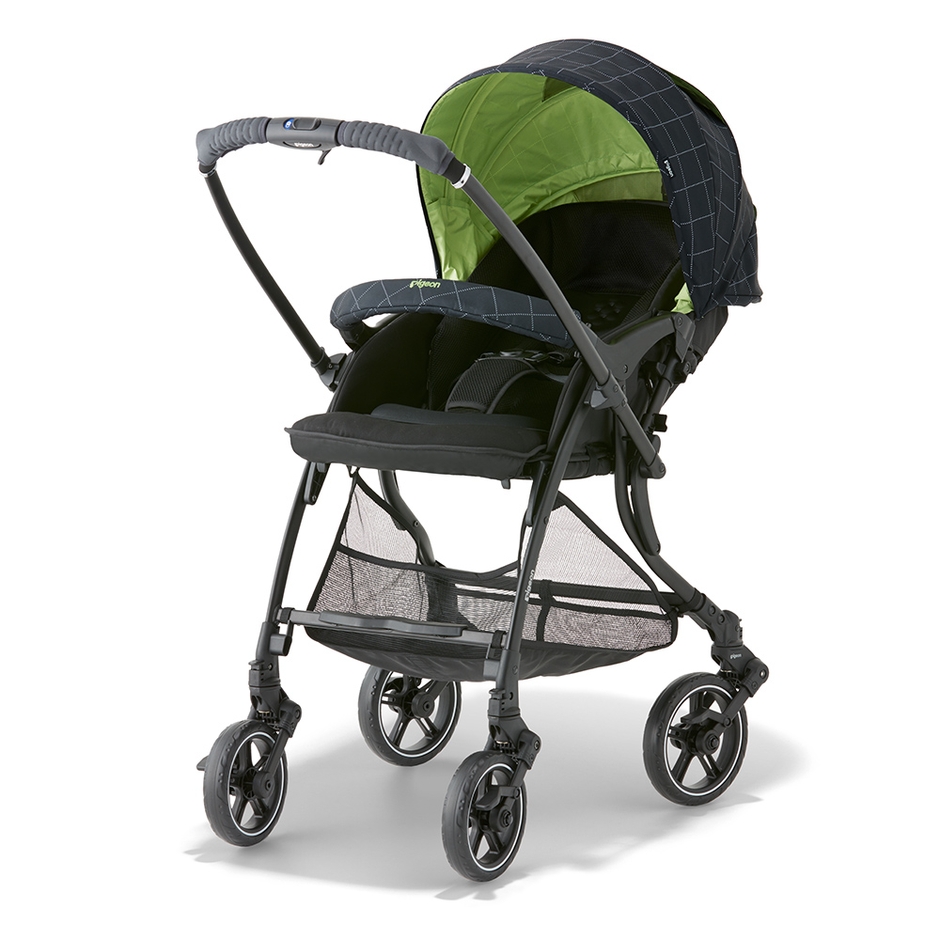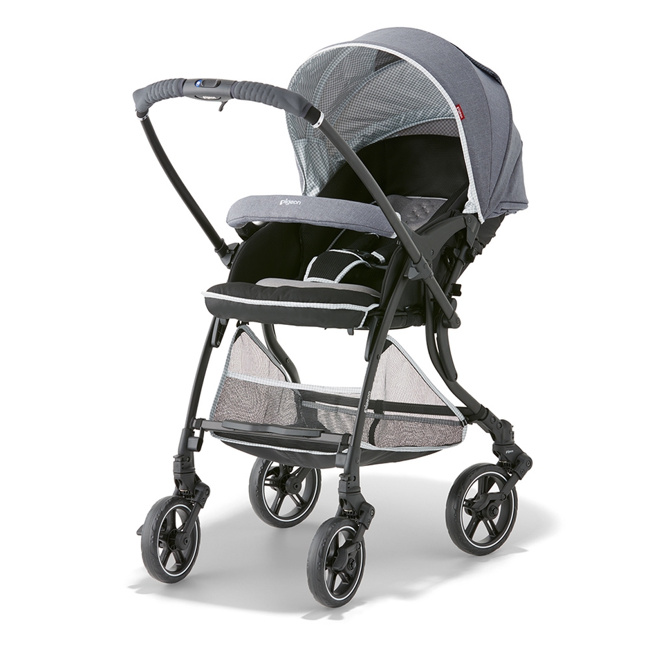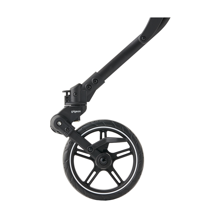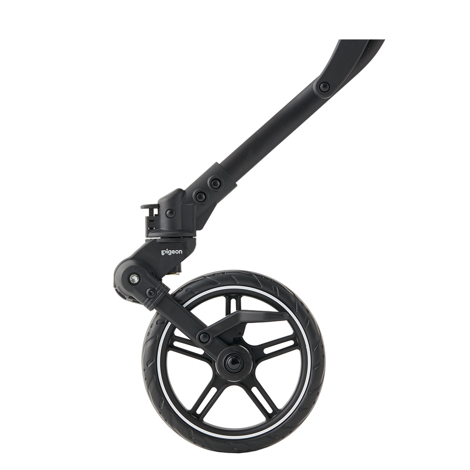 ハンドルからタイヤに繋がるフレーム構造を見直すことで、対面走行時に押す力がよりダイレクトにタイヤに伝わりやすくなりました。ベビーカーを押す際の足元はシングルタイヤの利点を生かして間隔が広く、足があたりにくいので自然な歩幅で歩けます。