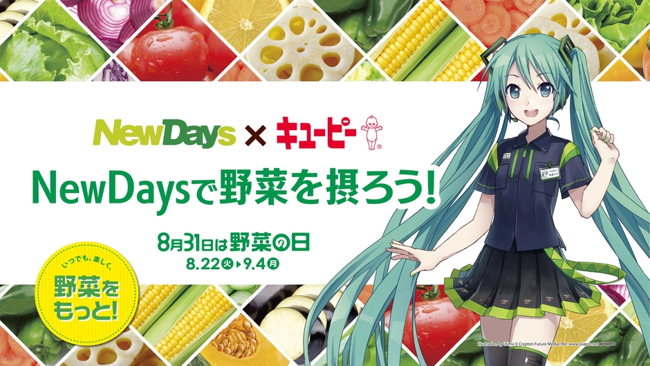 今回、PRキャラクターには野菜の日の8月31日に今年で生誕10周年を迎える「初音ミク」を起用いたします。オリジナルCMやオリジナル楽曲に加え、期間中に野菜の日キャンペーン対象商品を含む600円(税込)以上をお買い上げのお客さまへ先着でクリアファイル(全2種、初音ミク オリジナルイラスト使用)をプレゼントするキャンペーンも実施いたします。さらに、対象のNewDaysでは「初音ミク グッズ」も数量限定で販売いたします。