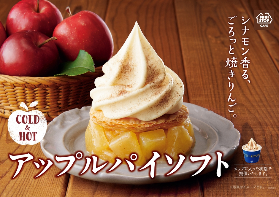 じっくりと焼き上げた「焼きりんご」とサクサクの「パイ」に、ソフトクリームをのせ、仕上げにシナモンシュガーを振りかけました。「フォンダンショコラ」に続く、ミニストップの「温×冷スイーツ」です。